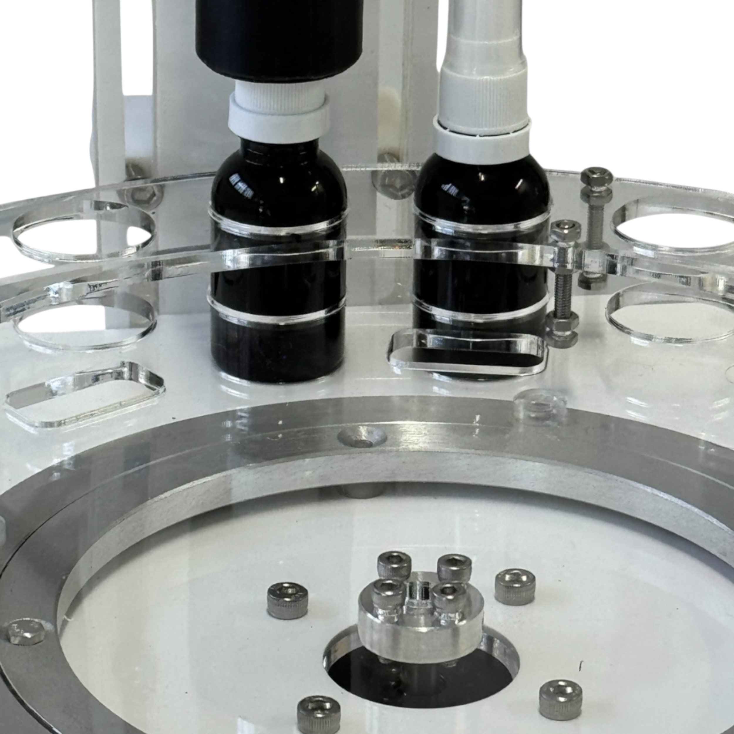 A envasadora conta com um sistema modular que pode ser configurado conforme a necessidade do cliente, garantindo flexibilidade no processo. A construção é feita em materiais duráveis e nobres, com componentes ajustáveis para diferentes volumes e tipos de líquidos. A bandeja rotativa acomoda diversos frascos simultaneamente, possibilitando a saída automática, o que agiliza o trabalho industrial.